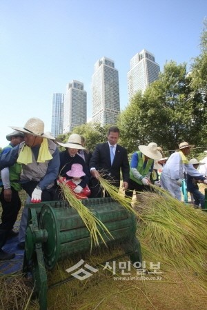 지난 13일 밥 돌(Bob Dold) 미연방하원의원(가운데) 일행은 미국 일리노이주에 있는 윌링시와 강남구 간 문화·경제 등 다양한 교류를 위해 강남구를 방문했다. 사진은 돌 의원이 가을걷이를 체험하고 있는 모습.(사진제공=강남구청)