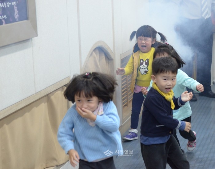 서울 영등포소방서는 지난 13일 소방서 4층 소방안전체험관에서 한남어린이집 보육교사와 어린이 30여명을 대상으로 화재시 대피요령과 안전한 불의 사용법 숙지를 위한 '소방안전체험교육'을 실시, 어린이들이 연기를 피해 대피하고 있다.(사진제공=영등포소방서)