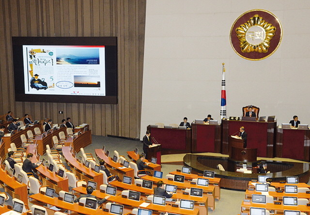 14일 오후 서울 여의도 국회에서 열린 제337회 국회(정기회) 제7차 본회의에서 새누리당 양창영 의원이 전광판에 한국사 교과서 관련 자료를 띄워놓고 황교안 국무총리에게 대정부질문 하고 있다.