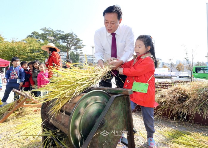 금천구는 지난 13일 오전 11시30분 어린이집 학부모와 어린이를 대상으로 벼 베기 등 '가을걷이 행사'를 실시했다. 사진은 전통 탈곡방식으로 가을걷이를 하는 차성수 구청장과 어린이의 모습.(사진제공=금천구청)