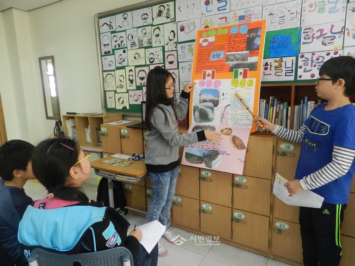 경기 부천시 석천초등학교는 지난 14일 '2015학년 서부지구 협동장학인 수업컨퍼런스'를 실시해 학생들이 친구들에게 세계 대륙에 대해 설명하는 모둠활동을 진행하고 있다.(사진제공=부천교육지원청)