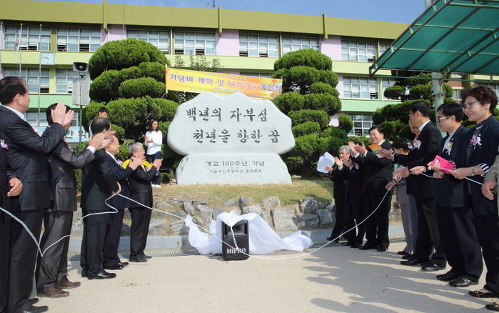 조길형 서울 영등포구청장(오른쪽에서 다섯 번째)이 최근 우신초등학교에서 열린 개교 100주년 기념식에 참석해 참석 내빈들과 기념비 제막식을 진행하고 있다.(사진제공=영등포구청)