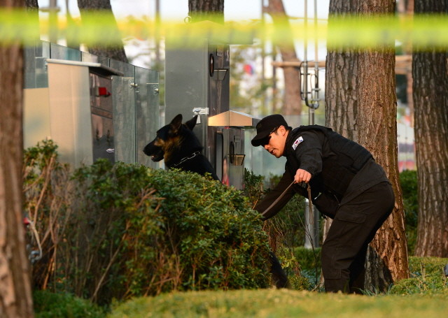 제2롯데월드 폭파 협박 전화가 접수 된 18일 오후 경찰특공대와 과학수사대 대원들이 서울 송파구 제2롯데월드몰에서 폭발물 수색을 하고 있다.