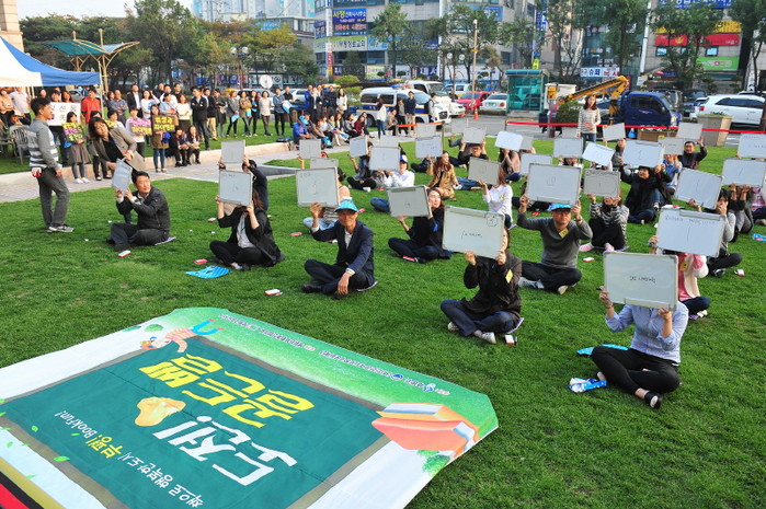 인천 부평구는 최근 독서의 계절을 맞아 구청 어울림마당에서 전직원을 대상으로 '부평구 공직자 독서골든벨'을 개최해 참여 직원들이 답을 칠판에 적어 들어보이고 있다.(사진제공=부평구청)