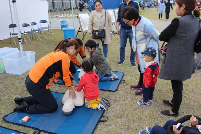 최근 인천공항소방서가 인천국제공항 잔디광장에서 개최한 '소방안전체험장'에서 어린이들이 소방대원의 지도에 따라 심폐소생술 체험을 진행하고 있다.(사진제공=공항소방서)