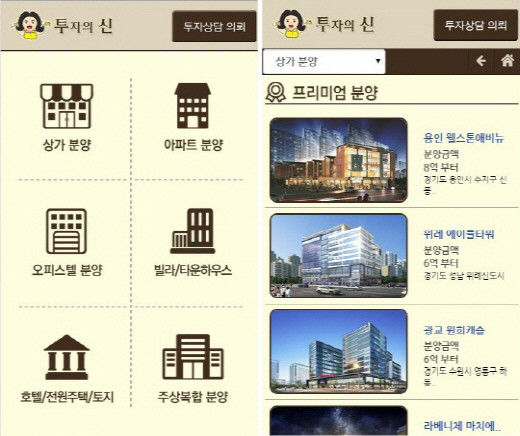 아파트 투자, 수익형 호텔 투자, 오피스텔 투자, 상가 투자, 빌라 투자, 타운하우스 투자, 전원주택 투자 등 부동산 투자를 할 때는 부동산 분양정보 어플인 "투자의 신" 에서 해답을 찾을 수 있게 되었다. 전국에서 분양하는 모든 분양 물건을 한 눈에 보며 비교가 가능하다.