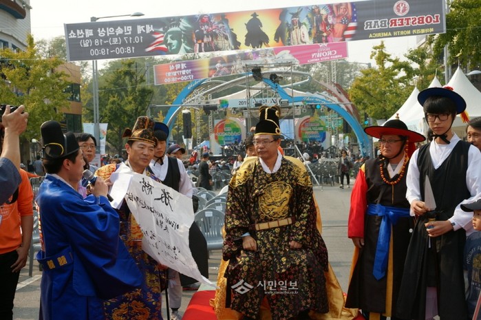 지난 17·18일 이틀간 용산 이태원 관광특구 일대에서 '2015 이태원지구촌축제'가 열린 가운데 지난 18일 오후 1시 메인무대 앞에서 '과거시험 재현 행사'가 진행됐다. 성장현 용산구청장이 정조 대왕으로 행사에 참여해 급제자 명단을 살피고 있다. (사진제공=용산구청)