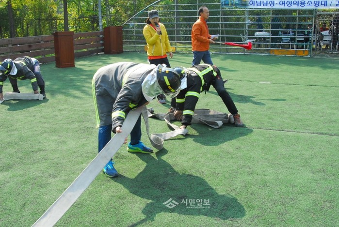 경기 하남소방서 의용소방연합대는 최근 하산곡동 풋살경기장에서 의용소방대원 80여명이 참석한 가운데 '2015 하남의용소방연합대 소방기술경연대회'를 개최해 소방호스 끌기 종목 참여자들이 경연을 펼치고 있다.(사진제공=하남소방서)