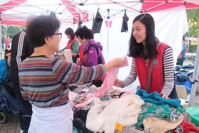지난 16일 서울시립강동노인종합복지관이 고덕역 광장에서 지역내 저소득 홀몸노인들을 대상으로 실시한 ‘착한마을 어울장터 바자회’에 참가한 한 주민이 물건을 고르고 있다.(사진제공=시립강동노인종합복지관)