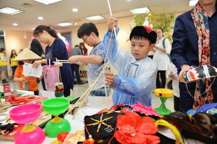 서울 동대문구청(구청장 유덕열) 다목적강당에서 지난 17일 오후 3시 열린 다문화 어울림 한마당 축제에 참가한 어린이들이 세계 각국의 장난감을 체험해 보고 있다.(사진제공=동대문구청)