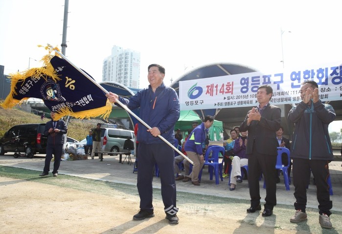 영등포구 안양천 족구장에서 지난 18일 열린 '제14회 영등포구 연합회장기 생활체육 족구대회'에 참석한 조길형 구청장(왼쪽)이 대회의 시작을 알리는 깃발을 흔들고 있다.(사진제공=영등포구청)