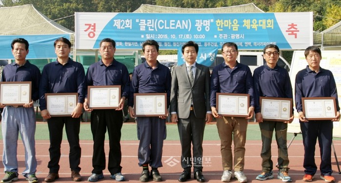 [광명=류만옥 기자]경기 광명시 노온정수장 다목적운동장에서 최근 열린 제2회 클린광명 한마음체육대회 개회식에 참석한 나상성 광명시의회 의장 등 각급 기관장이 미화원들을 격려하고 표창장을 수여했다. 사진은 나 의장(가운데)이 미화원들과 함께 기념촬영하고 있는 모습.