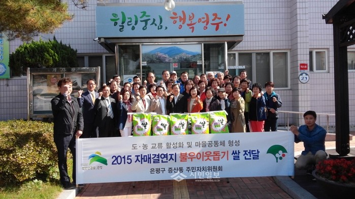 서울 은평구 증산동 주민자치위원회는 최근 자매결연지인 경북 영주시 하망동을 방문해 영주시 특산물인 쌀을 현지에서 직접 구매해 지역내 불우이웃에게 전하기 위해 전달식을 갖고 기념촬영하고 있다.(사진제공=은평구청)