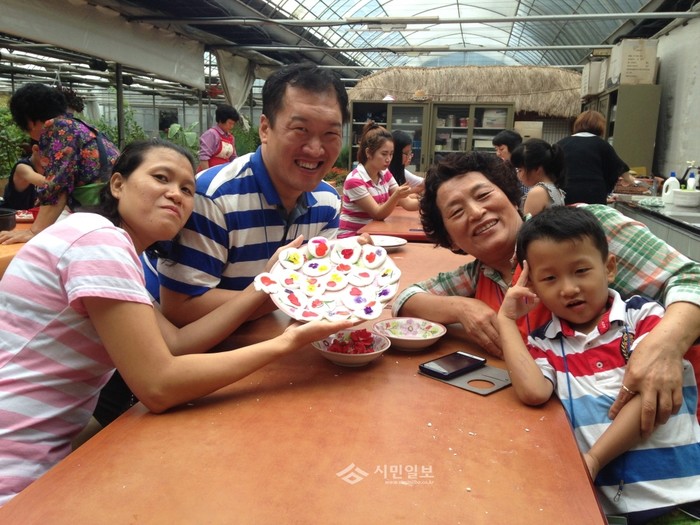 서울 중랑구 망우3동 주민자치위원회는 최근 지역내 다문화 가족 40명과 함께 특별한 농촌체험을 진행했다. 사진은 농촌체험에 참가한 가족들이 만든 화전을 들고 즐거워하는 모습.(사진제공=중랑구청)