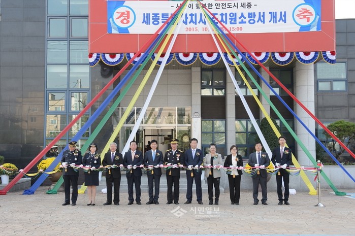 세종시 조치원소방서가 최근 이춘희 시장 및 의용소방대원, 지역주민 등 200여명이 참석한 가운데 개서식을 개최했다. 사진은 이 시장(왼쪽에서 다섯 번째)과 참여 내빈들이 테이프 커팅식을 진행하는 모습.(사진제공=세종시청)