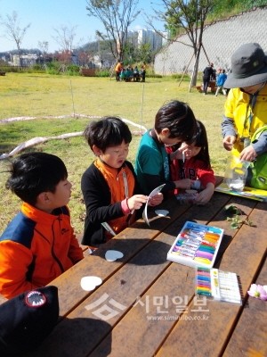 경기 부천시 범박초등학교는 1학년 학생들을 대상으로 최근 범박산을 찾아 생태체험 수업을 진행한 가운데 참여 어린이들이 꽃과 열매로 고리 만들기 체험을 하고 있다.(사진제공=부천교육지원청)