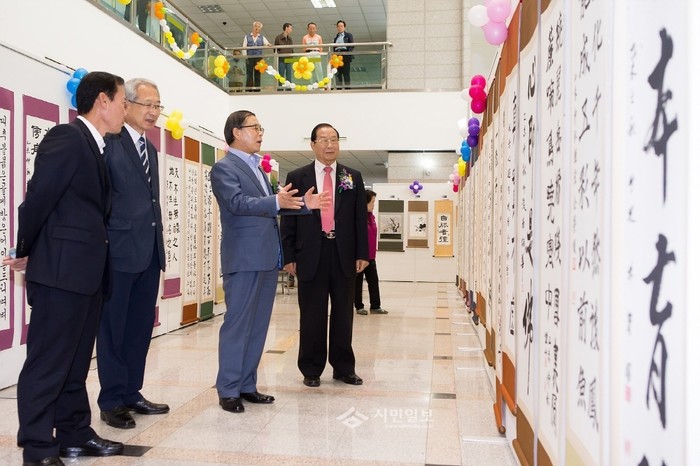 경북 구미시 노인종합복지관이 최근 2015년도 '어르신 문화예술축제'를 개최한 가운데 남유진 구미시장(왼쪽에서 세 번째)이 관계자들과 노인들의 서예 작품 전시를 감상하고 있다.(사진제공=구미시청)