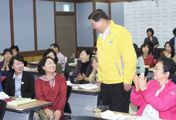 지난 20일 원광디지털대학교에서 열린 '제2기 노인상담 전문봉사자 양성교육' 현장을 찾은 조길형 영등포구청장(오른쪽)이 참여 봉사자들에게 격려의 인사를 전하고 있다.(사진제공=영등포구청)