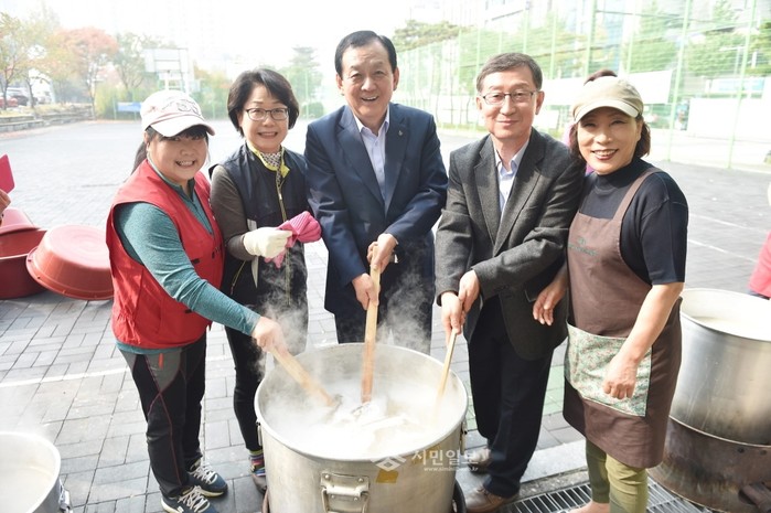 경기 하남시 여성단체협의회 회원 30여명은 21일 시청 농구장에서 전통 고추장을 직접 만들어 어려운 이웃에게 나누는 행사를 열었다. 이교범 하남시장(가운데)이 회원들과 함께 고추장을 만들며 기념촬영하고 있다.(사진제공=하남시청)