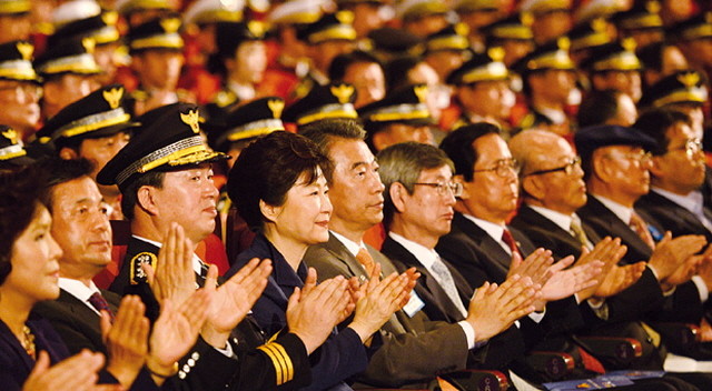 박근혜 대통령이 21일 오전 제70주년 경찰의 날 기념식에 참석, 축하공연을 보며 박수치고 있다.