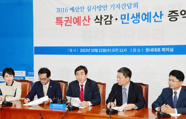 21일 서울 여의도 국회에서 열린 새정치민주연합 예산안 심사방안 기자간담회에서 이종걸 원내대표가 발표를 하고 있다.