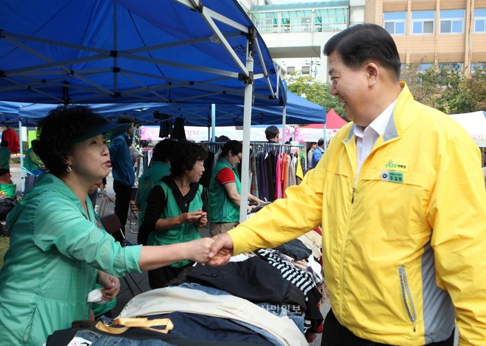 지난 21일 영등포구청 앞마당에서 이웃과 나눔을 실천하는 '10월 나눔장터'가 열린 가운데 조길형 영등포구청장(오른쪽)이 헌옷을 판매하고 있는 참여자와 악수하고 있다.(사진제공=영등포구청)