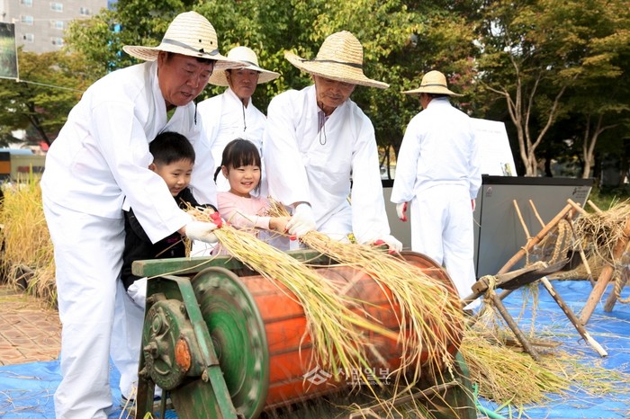지난 21일 성동구청 앞 광장에서 열린 '벼 베기 및 탈곡 체험행사'에서 구립 왕십리어린이집 원아들이 기계를 이용한 탈곡체험을 하고 있다.(사진제공=성동구청)