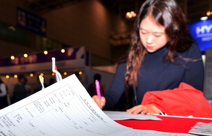 지난 21일 오전 광주 서구 김대중컨벤션센터에서 '2015광주·전라 청년20만+창조 일자리 박람회'가 열리고 있는 가운데 한 구직자가 이력서를 작성하고 있다./뉴시스