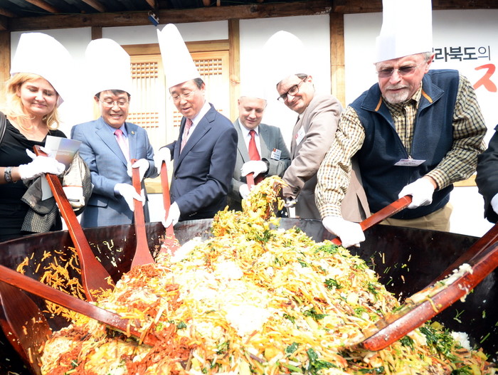 '제13회 전주국제발효식품엑스포 개막식'이 22일 전북 전주월드컵경기장에서 열린 가운데 송하진 전북지사와 김광수 전북도의회 의장 등 내빈들이 비빔밥 비비기 퍼포먼스를 하고 있다./뉴시스