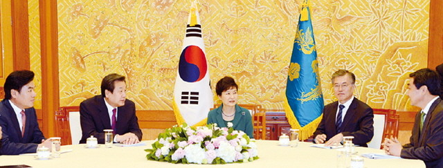 박근혜 대통령이 22일 오후 청와대에서 여야 지도부와 회동하고 있다. 새누리당 원유철(왼쪽부터) 원내대표, 김무성 대표, 박근혜 대통령, 새정치민주연합 문재인 대표, 이종걸 원내대표.