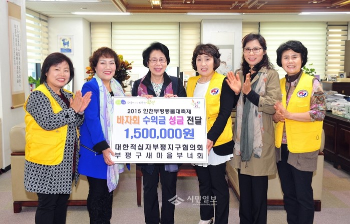 인천 부평구 새마을부녀회와 대한적십자부평지구협의회는 22일 홍미영 구청장(왼쪽에서 세 번째)에게 인천부평풍물대축제 기간 중 부대행사로 진행된 '부평 골 먹거리 장터 바자회'를 통해 얻은 수익금 150만원을 어려운 이웃에게 써달라며 기탁하고 기념촬영하고 있다.(사진제공=부평구청)