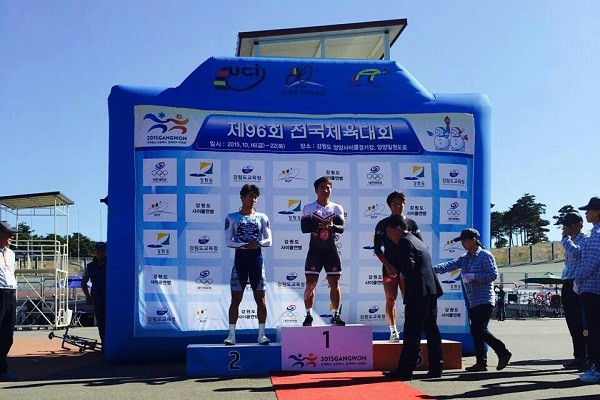 | 사진은 전국체전 사이클 일반부 1km 개인독주 결승에서 은메달을 획득해 시상대에 오른 김우겸(좌)선수 | ||