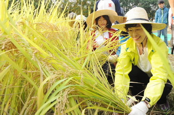 박춘희 송파구청장, 벼베기행사에서 학생들과 벼베기 체험
