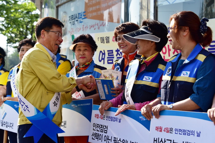 | ▲ 경기 김포시가 사우동 사우사거리에서 본격적인 여름 휴가철이 다가옴에 따라 물놀이로 인한 인명사고 발생을 최소화 하기 위한 '물놀이 안전사고 예방 캠페인'을 펼쳤다. 사진은 유영록 시장이 캠페인 참가자들과 악수를 나누고 있는 모습. | ||