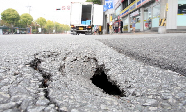광주시는 오는 26일 동구 서석동 조선대학교 후문 인근 교차로에서 발생한 땅꺼짐에 대한 현장 조사와 복구 작업을 벌일 방침이라고 25일 밝혔다. 사진은 지난 23일 오후 조선대 후문 모 사진관 앞 도로가 패여 있는 모습.