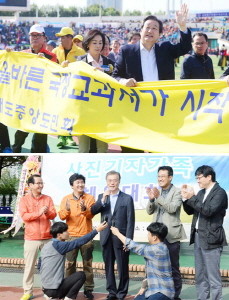 새누리당 김무성 대표가 25일 서울 목동운동장에서 열린 대통령기 이북도민체육대회에서 ‘역사 바로 세우기는 올바른 국정교과서가 시작이다’ 문구가 적힌 플래카드를 들고 참석자들에게 인사하고 있다(위). 이날 새정치민주연합 문재인 대표 서울 여의도 국회 운동장에서 열린 2015 한국사진기자협회 체육대회에 참석해 사진기자 가족들에게 인사말을 하고 있다.