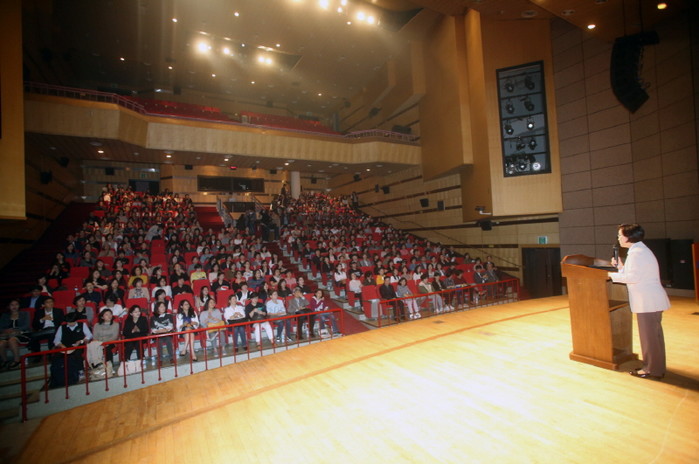 최근 서울 강남구민회관에서 열린 고등학교 1·2학년, 중학교 3학년 학생들과 학부모를 대상으로 고교생활과 대입에 필요한 정보를 제공하는 ‘진로진학설명회’에 참석한 신연희 구청장이 인사말을 하고 있다.(사진제공=강남구청)