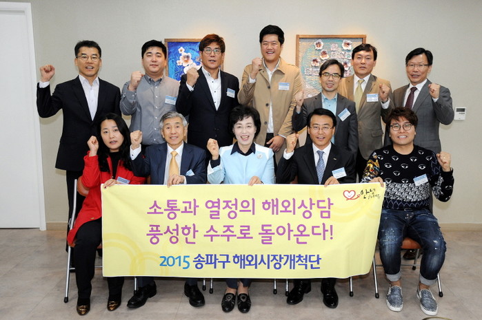 최근 박춘희 서울 송파구청장이 구청장실에서 지역의 중소기업에서 선발된 ‘2015 송파구 해외시장개척단’을 초청해 간담회를 실시한 후 참가자들과 함께 기념촬영을 하고 있다.(사진제공=송파구청)