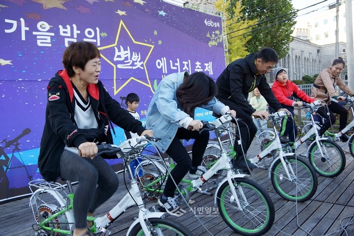 지난 24일 성북구청 바람마당에서 펼쳐진 ‘가을밤의 별빛 에너지 축제’에서 시민들이 자전거발전기로 더 많은 전기를 생산하는 게임을 즐기고 있다.(사진제공=성북구청)