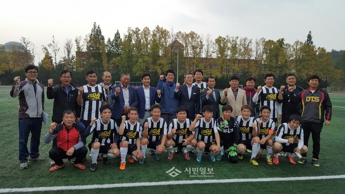 [무안=황승순 기자]전남생활체육대회가 지난 25일 무안군 스포츠파크에서 개막, 초당대 축구장에서 펼친 신안군 축구팀이 함평군 팀을 첫 상대로 4대 0 첫 완승을 거둔 쾌조의 출발에 따른 기쁨을 양광 회장, 김영배 군 체육회 부회장, 신안군 팀, 생활체육회 관계자들과 함께 나눴다.(사진=황승순 기자)