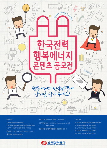 한편 한국전력은 '행복에너지 콘텐츠 공모전' 이외에도 전력서비스 개선 국민제안 공모, 대학생 서포터즈 운영 등 다양한 채널을 통해 국민과의 소통을 강화하고, 더욱 편리한 전력 서비스를 제공하기 위해 활발히 노력하고 있다.