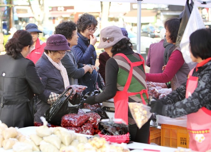 영등포구가 지난 27일 구청앞 광장에서 '농수축산물 직거래 장터'를 개최한 가운데 행사장을 찾은 주민들이 대추를 시식해보며 구매하고 있다.(사진제공=영등포구청)
