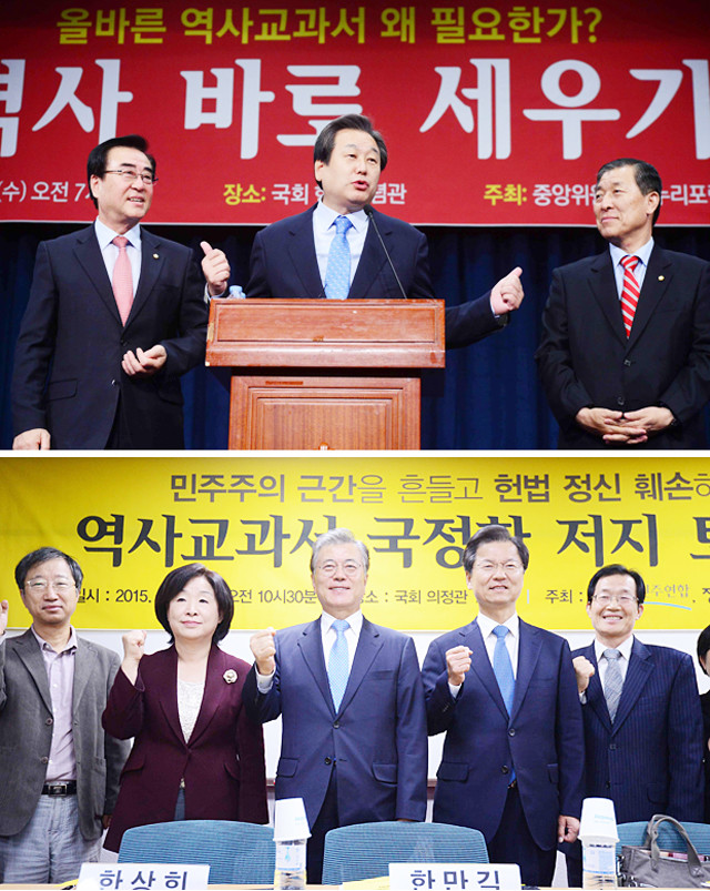 새누리당 김무성 대표와 황진하 사무총장, 김태원 의원이 28일 서울 여의도 국회 헌정기념관에서 열린 당 중앙위원회 새누리포럼 ‘역사 바로 세우기, 올바른 역사교과서 왜 필요한가?’에서 인사말을 하고 있다(위). 28일 서울 여의도 국회 의정관에서 열린 역사교과서 국정화 저지 토론회에서 새정치민주연합 문재인 대표와 정의당 심상정 대표, 무소속 천정배 의원이 기념촬영을 하고 있다.