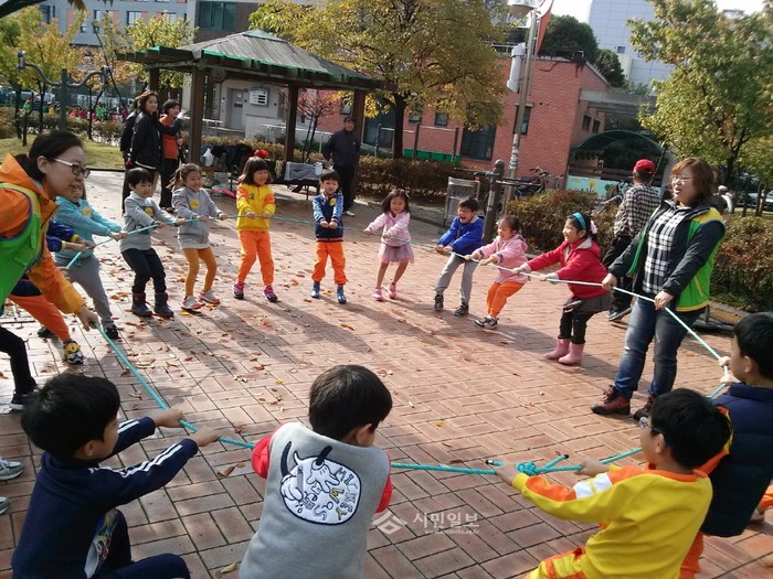 지난 27일 서울 강동구 성내동 하니공원에서 4개 어린이집을 대상으로 실시된 ‘밖으로 나가 놀자’ 프로그램에 참가한 어린이집 원아들이 끈을 이용해 대형원을 만들며 신나게 놀고 있다.(사진제공=강동구청)