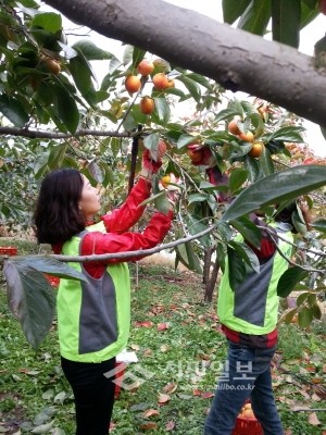 경북 도립구미도서관은 지난 27일 직원 10여명이 참여한 가운데 선산군 내고리에 위치한 감농장을 찾아 '사랑나눔 농촌봉사활동'을 실시해 참여 직원들이 감을 수확하며 구슬땀을 흘리고 있다.(사진제공=경북교육청)