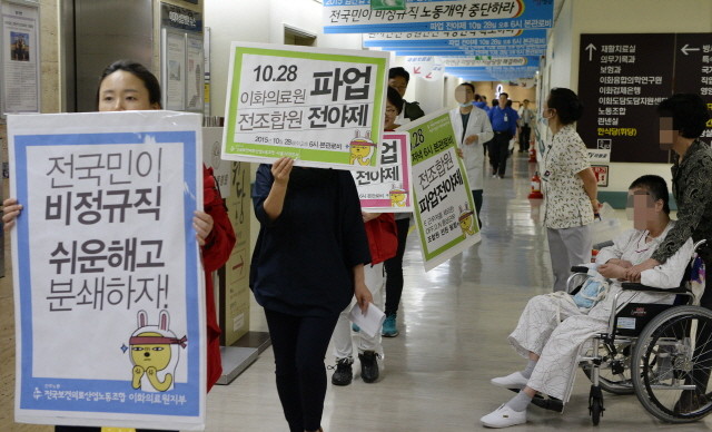 전국보건의료산업노동조합이 임금 인상과 비정규직 문제 해결 등을 위한 총파업을 예고한 가운데 28일 오후 서울 양천구 이화여대 의료원에서 노조원들이 총파업 전야제 참여를 위한 순회 선전전을 벌이고 있다.