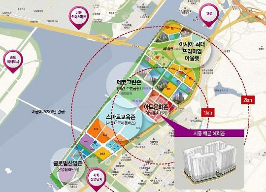 배곧신도시는 약 150만평 규모의 21,000세대를 수용하는 저밀도 자족도시로 아름다운 수변경관을 자랑하는 친환경 도시로 개발된다.