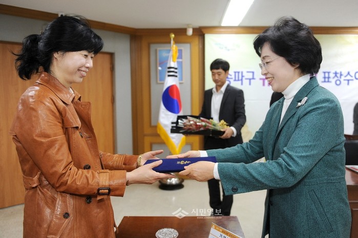 지난 28일 박춘희 송파구청장(오른쪽)이 청내 기획상황실에서 이웃사랑과 나눔을 실천한 지역주민 17명에게 표창하는 '10월 유공구민 표창수여식'에 참석, 표창장을 수여하고 있다.(사진제공=송파구청)