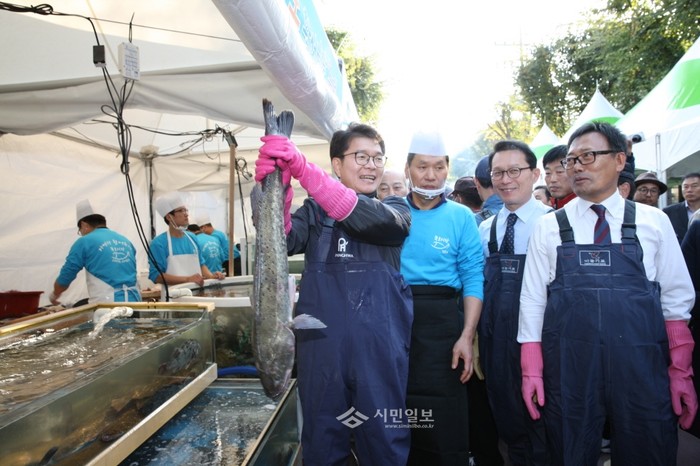 성동구는 지난 28일 뚝도시장 일대와 뚝섬나루에서 '뚝도시장 활어축제'를 열었다. 사진은 축제에 참석한 정원오 구청장이 연평도에서 당일 잡은 싱싱한 활어를 수조에 옮겨 넣고 있는 모습.(사진제공=성동구청)