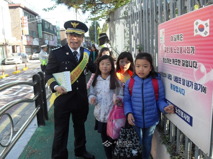 29일 경기 구리경찰서가 구리시 교문동에 위치한 백문초등학교 통학로에서 '어린이 교통안전 캠페인'을 실시한 가운데 백동흠 경찰서장이 등교 중인 아이들과 기념촬영을 하고 있다. 이번 캠페인은 올해 교통경찰의 교통사망사고 10% 감소 등을 목표로 하는 'All Safe-Up' 프로젝트의 성공을 위해 마련됐다. (사진제공=구리경찰서)